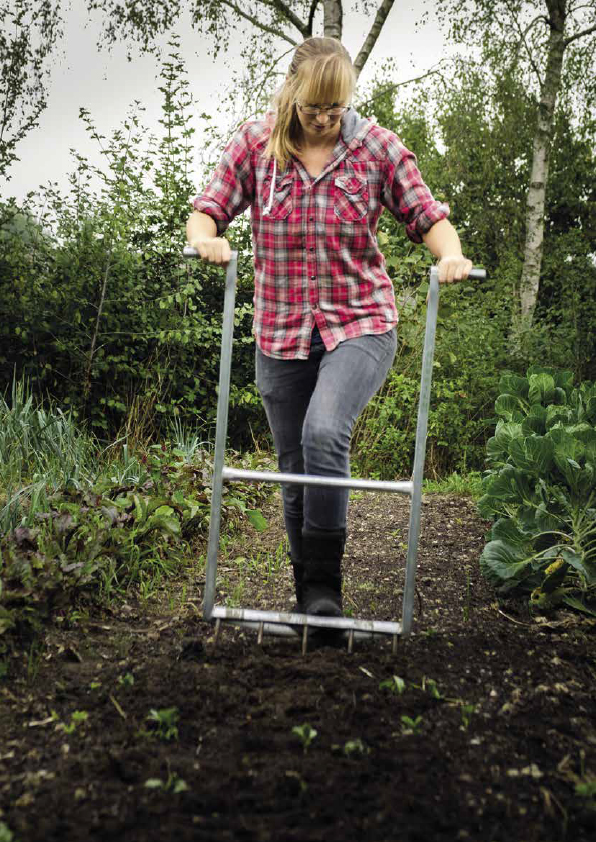 vaak helemaal op staan. Vervolgens trek je de grelinette naar je toe. Dan haal je de grelinette uit de grond, zet je een stap achteruit en herhaal je het proces. Heb je hier eenmaal wat handigheid in, dan doe je een heel bed in een mum van tijd.