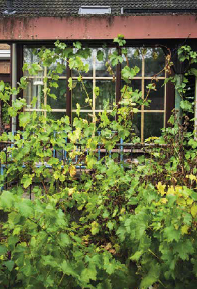 In mijn achtertuin stond, toen ik er kwam, al een pergola die het terras van het grasveld scheidde. Zelf heb ik haaks daarop nog een tweede pergola neergezet: tussen het pad langs het huis en het grasveld in. Langs deze pergola laat ik druiven groeien. Ik leid ze van de pergola naar het huis. Zo krijg ik een soort van groene corridor langs het huis die in de zomer schaduw biedt en het huis verkoelt. In de winter laat hij de zon wel door zodat het huis lekker kan opwarmen. En natuurlijk zijn er in de zomer heerlijke druiven van te oogsten. December/januari is een goed moment voor het groot onderhoud aan de druiven: je kunt pas snoeien als de sapstroom tot rust is gekomen. Snoei op een vorstvrije dag.